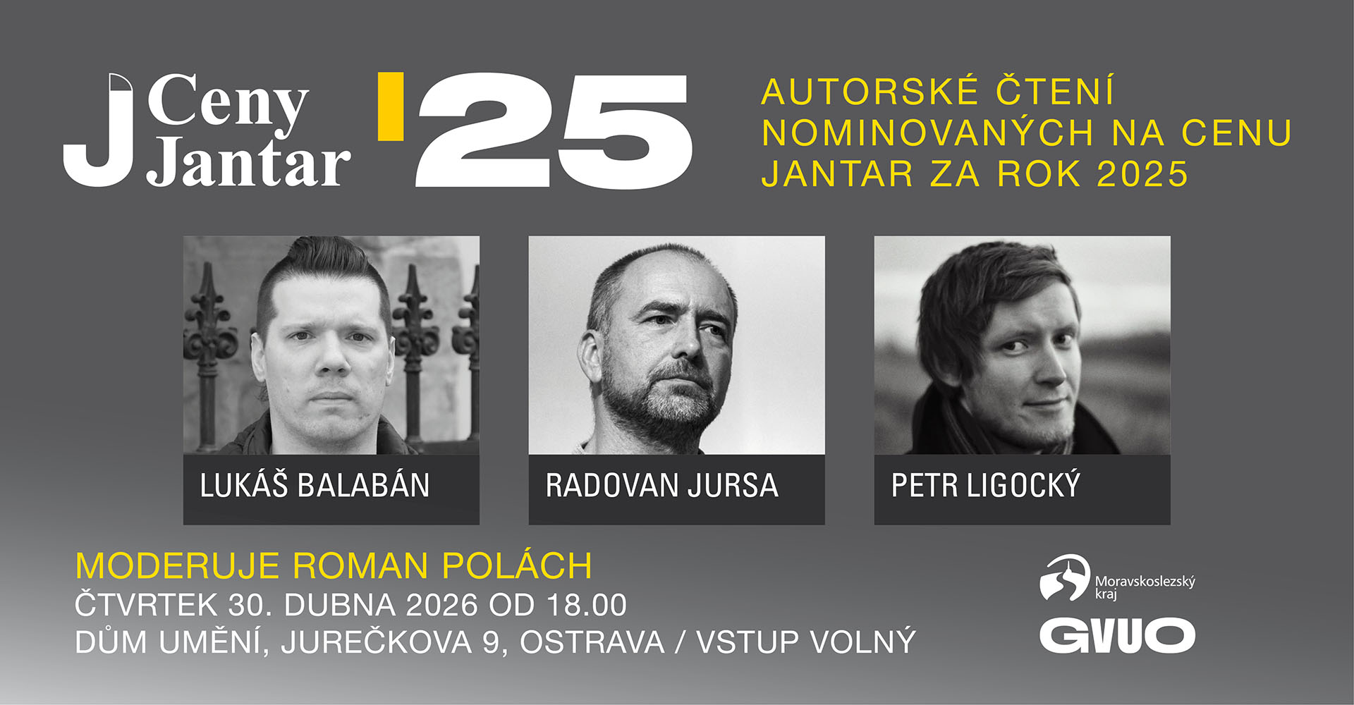 Setkání se třemi autory, kteří jsou nominováni na Cenu Jantar za rok 2025 v kategorii Literatura, se uskuteční ve čtvrtek 30. dubna v ostravském Domě ...